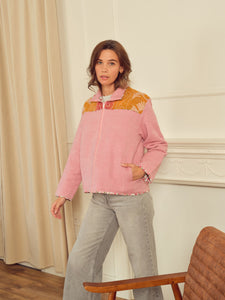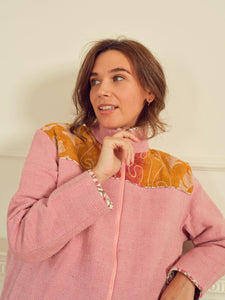 An oversize boxy fit jacket is made using hand-loomed fabric (hand-spun on manual spinning wheels and woven on manual looms) in villages in Punjab, North India. A bestseller, it combines handloom, hand-block printing with up-cycled details on the yoke. A season-less and genderless piece, layer away as it gets cooler. The fabric is home dyed, home-spun and handwoven making it breathable even in the hottest season. Please refer to the Fit Tip details before ordering. Due to the nature of the fabric no two jackets will ever be exactly the same.